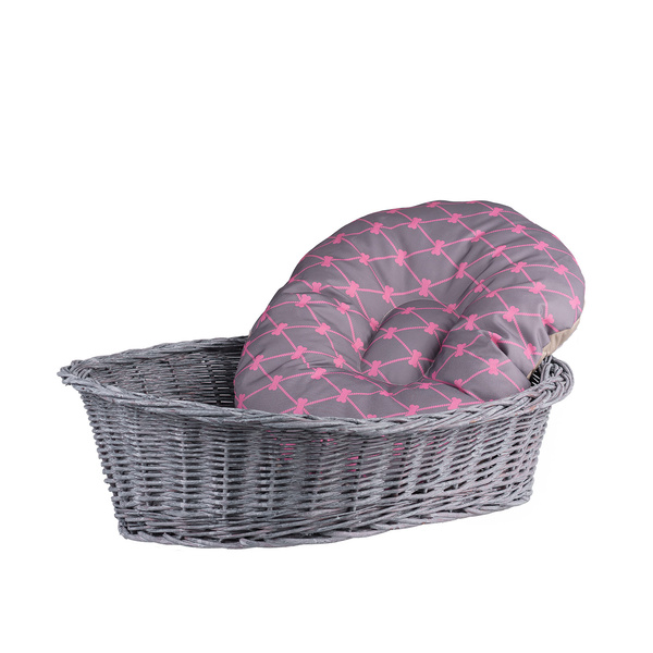 Un joli corbeille pour chien ou chat ovale, a bord tresse en osier avec une large ouverture qui permet d'entres et de sortir facilment du panier. Le panier est disponible dans d'autres tailles et ainsi couleurs de coussin.