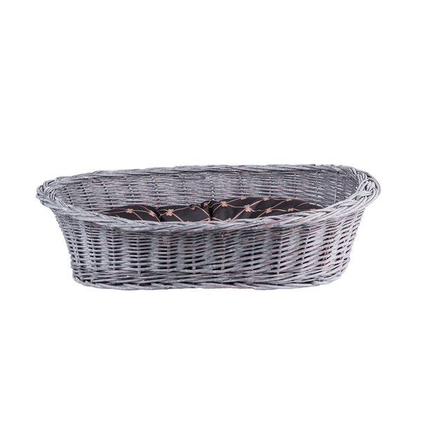 Un joli corbeille pour chien ou chat ovale, a bord tresse en osier avec une large ouverture qui permet d'entres et de sortir facilment du panier. Le panier est disponible dans d'autres tailles et ainsi couleurs de coussin.